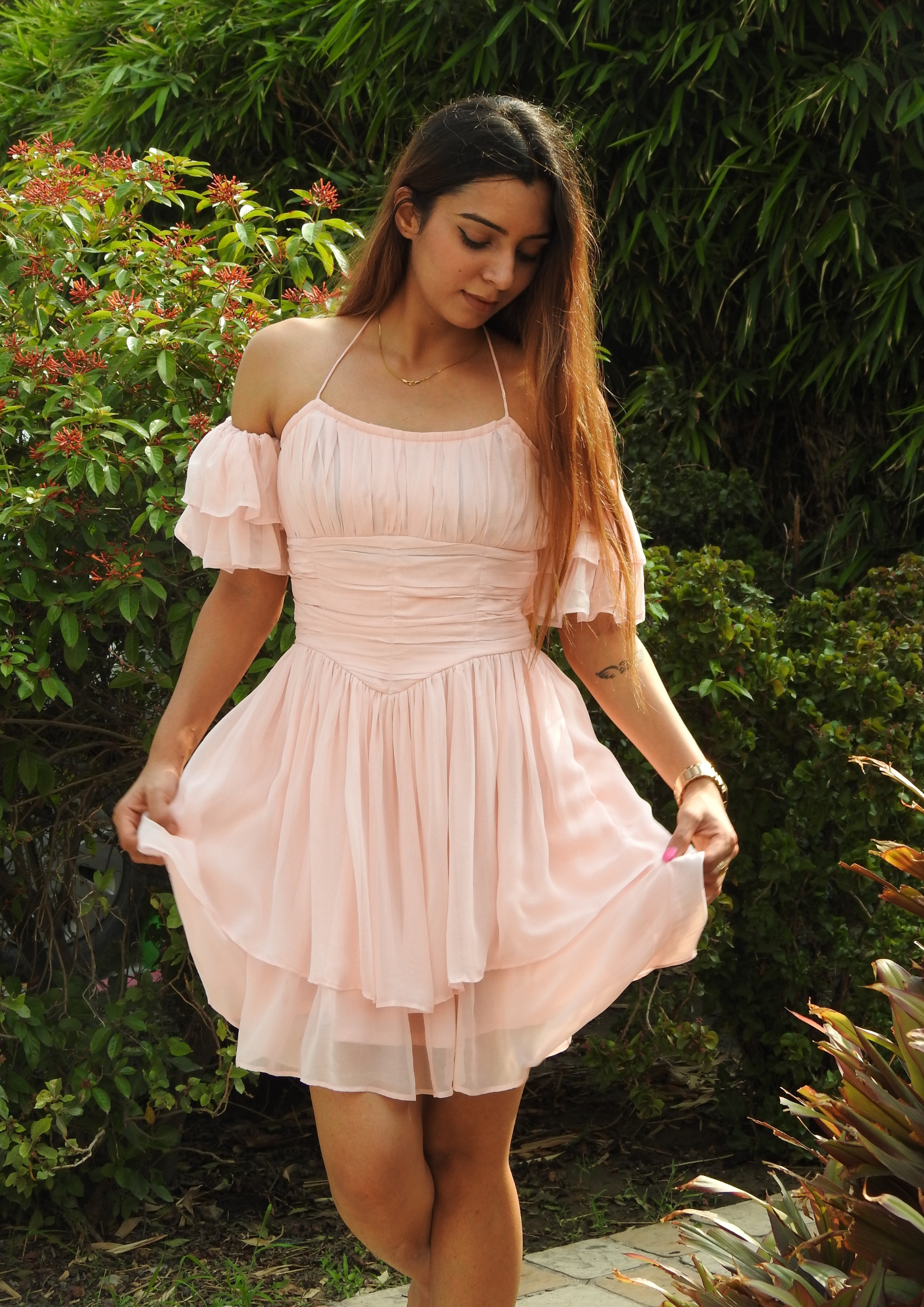 The Isalie dress is made for lovers of delicate details. With layered frills, gentle gathers, and a flowing tiered skirt, this baby pink georgette dress feels dreamy yet comfortable. The elasticated back and side zipper ensure a perfect fit, making it one of the most versatile new season dresses.