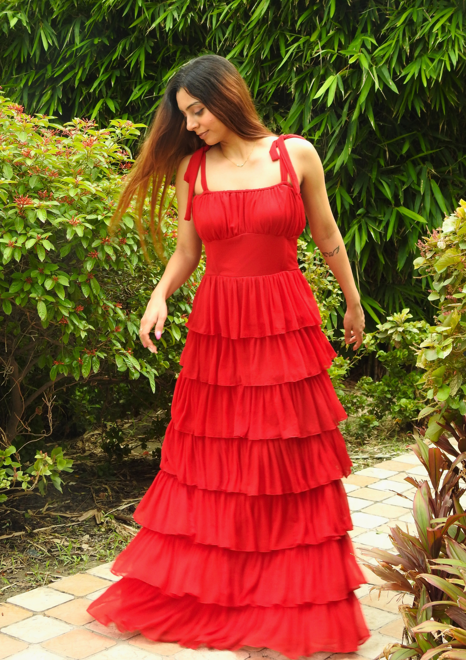 Bold yet graceful, Vivienne is a red chiffon dress designed to make an impact. Flowing tiers and gathered bust details create an elegant silhouette, perfect for evening events, birthdays, celebrations, and special occasions. A timeless choice for anyone searching for party wear and birthday dresses for women.