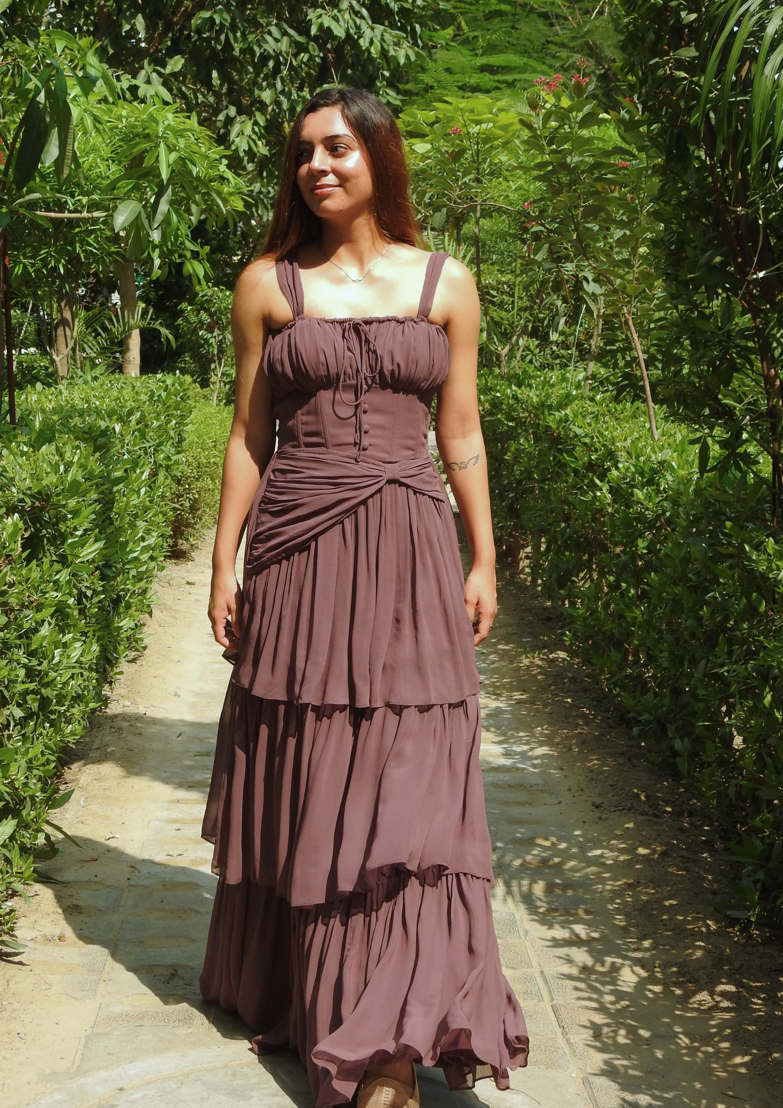 The Vionette dress in rich wine tones showcases soft gathers and a graceful three-tier design. This georgette fit-and-flare dress enhances the waist beautifully, making it perfect for those who love timeless silhouettes with a romantic feel.