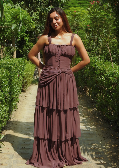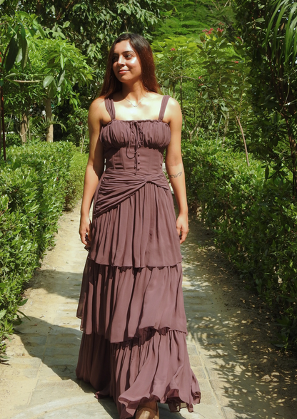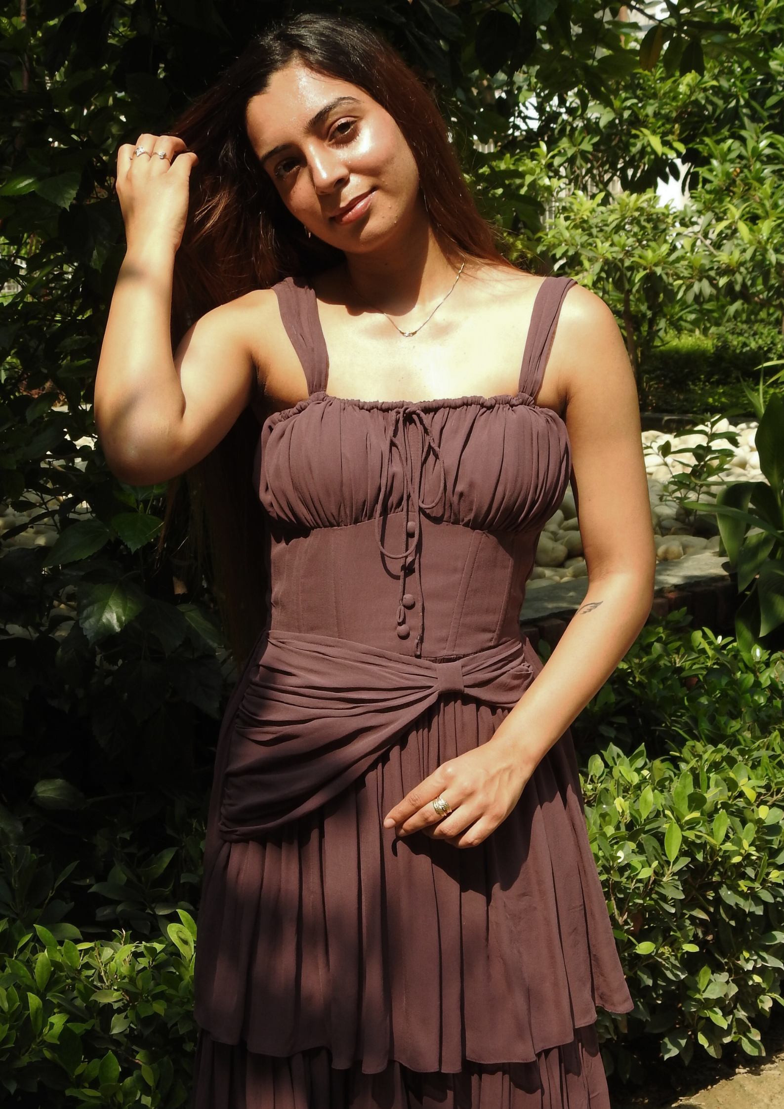 The Vionette bustier features delicate gathers and a graceful three-tier design below the waist, creating a soft, flowing silhouette. Its beautiful drape at the waist enhances femininity, making it perfect for a dreamy, elegant look.